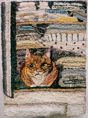 Hooked by Louise Creed Submitted March 2002 This was the first rag rug I made to my own design, and, by a series of chances, a photograph of it was published in Emma Tennant's book Rag Rugs of England and America (Walker Books,1992) and later in Juliet Bawden's Rag Rug Inspirations (Cassell, 1996) among various others of my cats. In this way, Rosie, our cherished cat, rose to fame, and I still think of her when I visit the airing cupboard with an armful of linen! She has hung in many galleries all over England and Wales, and photographs of her (available as cards) are, I am told, framed and displayed in countless homes. The craftsmanship of this rug is appalling, as it was made so near the beginning of my self-taught rug-making, but this seems to have no effect on its appeal to cat-lovers.Rosie and her brothers, sisters, cousins, second cousins, and great uncle Gregory have been the subjects of many subsequent rag rugs. To see Rosie and her relations visit www.louisa-creed-ragrugs.co.uk