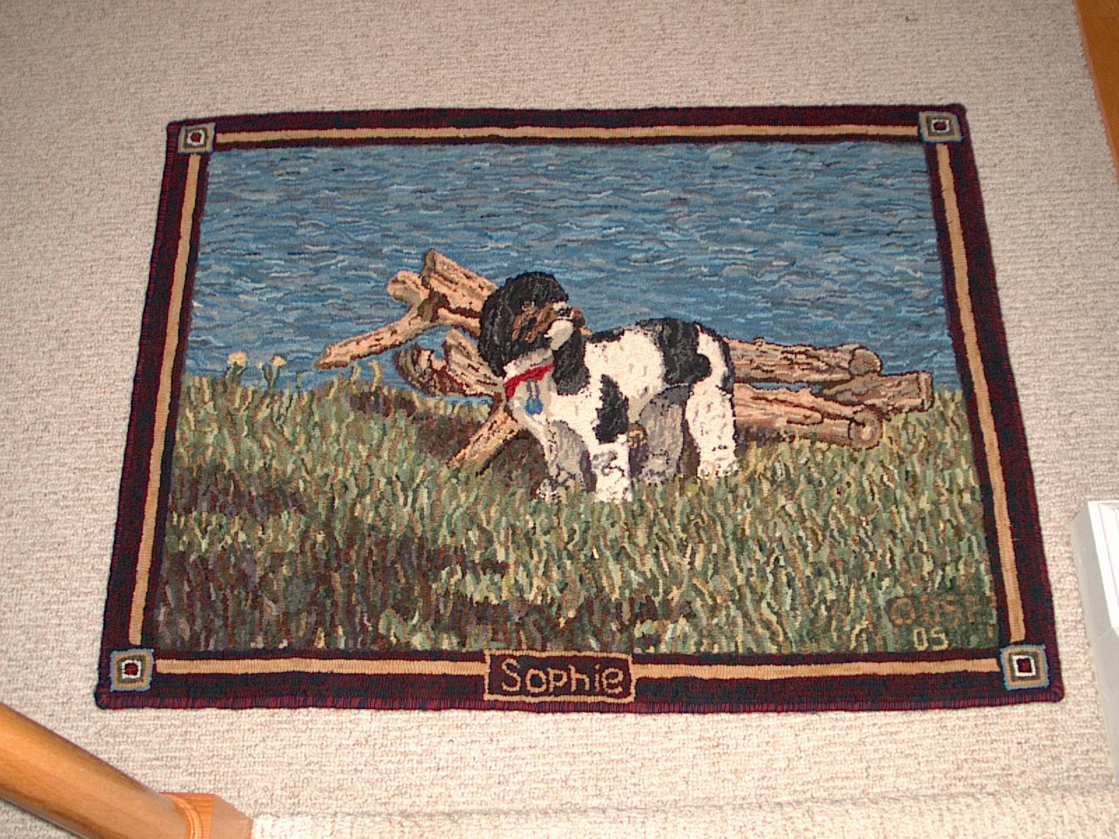 Hooked by Debbie Fezzuoglio Submitted February 2005 This rug is the second one I've ever done. It was a labor of love since the sweet subject is our beloved dog Sophie, a five year old Cockapoo. She was posing like a model in front of my dad's cottage on the shore of Lake Ontario. I did quite a bit of dying for this project, using not only ProChem dyes, but natural ones as well.......eggplant skins, onion skins, roasted chestnut hulls and coffee. It was a fantastic learning experience and I look forward to my next project.