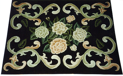The "Artemas Scroll" pattern is a copy of a primitive rug in the historical home of Artemas Ward of Shrewsbury, Massachusetts. I had the opportunity of visiting his home and I made a quick drawing of the scroll on a piece of scrap paper. The center has been changed from primitive roses to traditional roses, but the scroll remains the same.