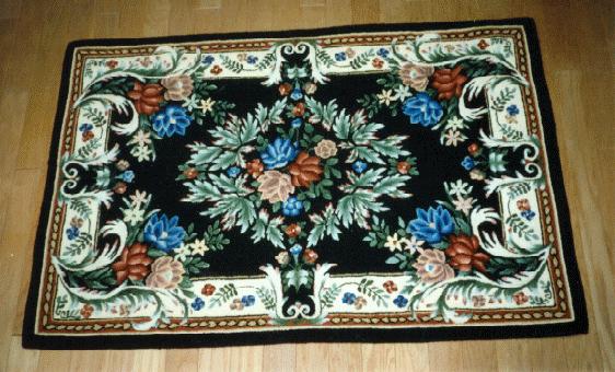 Duchess is a Persian pattern I designed for Claire Taylor. She was very kind to let me use it as a pattern for the Rugger's ROundtable. It is very beautiful. Notice that the center background is continued into the border at the corner motifs. This is very effective. Also, the leaves in the center motif form a circle enclosing the three large flowers. Claire's rug is outstanding; I dyed her choice of colors. This pattern can be worked in solid colors and outlined in a dark color as in most Persian rug patterns, or it can be hooked with swatches and/or dip-dye for shading the flowers, leaves and scrolls. | |