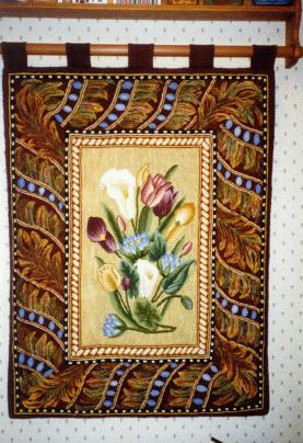 ![]() Hooked and Designed by Jane Olson Featured in January 2000 Rugger's Roundtable The frame is mostly made up of leaf designs. The colors for the frame are dark yet soft mahongany, blue. gold and green. The colors are repeated in the flower arrangement of the pattern center. Pattern-#635-J : Exotica Size: 33" x 43" Shp. Wht.: 1lbs. Pattern Only: Price: $40.00 on Burlap : $54.00 on Monk's Cloth : $60.00 on Rug Warp |