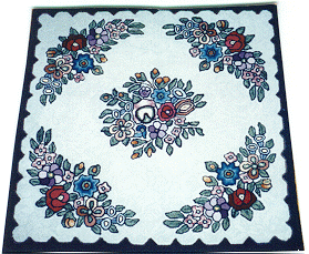 Primitive Nosegay was inspired by some quilted applique patterns. I adopted this into a square rug. Most of the flowers are repeated throughout the design. The flowers are primitive, and can be worked in solid colors and outlined, or can be shaded with swatches or dip-dyed material.