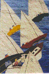 "Boat Race" is my own design. I dyed most of the wools, dying over a light blue for the blues, and an off white for the sails. It was finished in spring of 1997, in time for my grandson's 3rd birthday. It hangs on the wall over his bed. Maybe when he's older it will go on the floor!