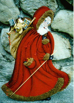 The bag, pocket and bag were hooked on separate monks cloth and attached with two or three rows of hooking to the original pattern and then finished normally. I wittled a cane and then slipped it through the glove. I filled the bag with small toys.