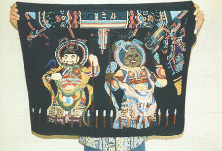 I love to hook! When my oldest son "hinted" that he'd like me to make him a rug, after I'd hooked his brother an eagle rug, I was flattered and excited to do just that. But...then he showed me a photograph from a library book of two carved and painted guards standing in front of a temple in Korea.
